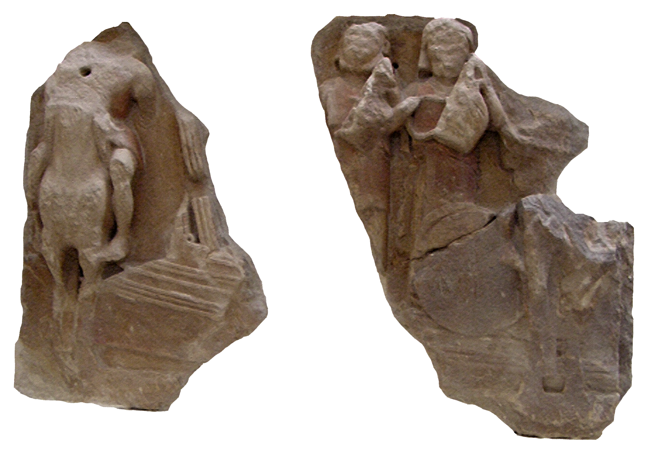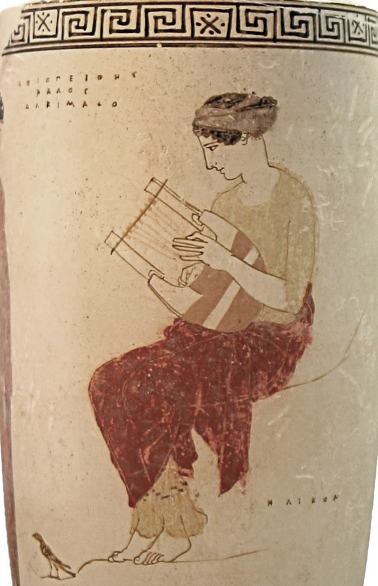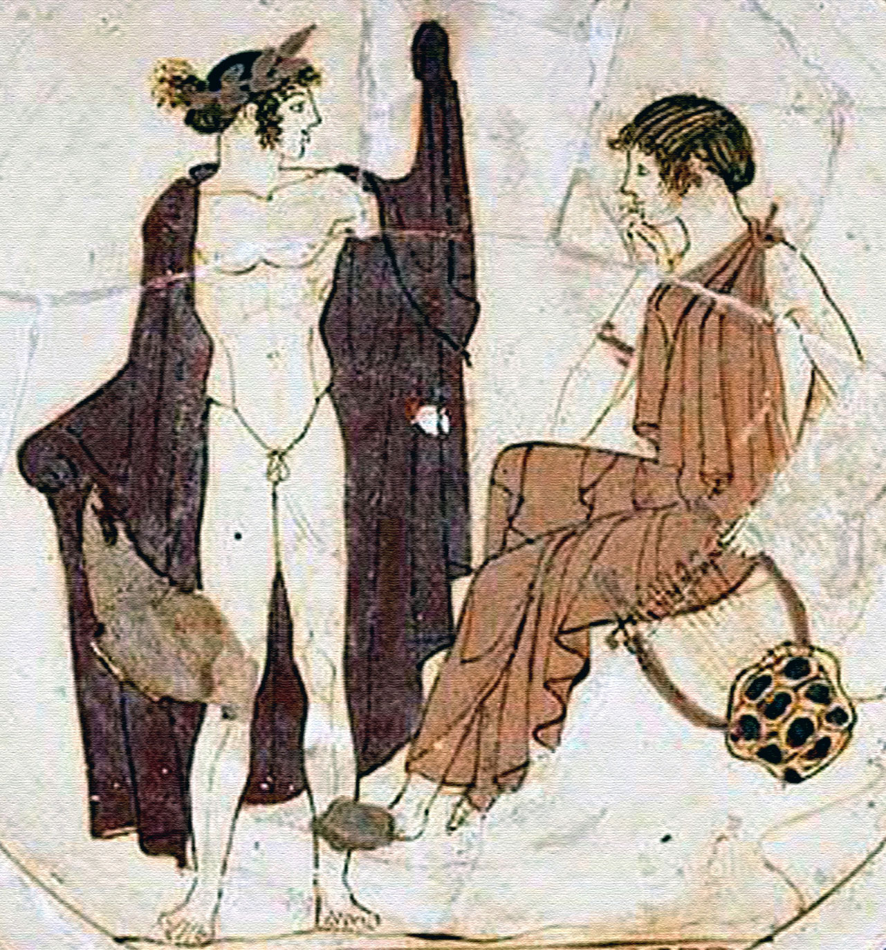 Μούσες και βοσκός, μάλλον ο Ησίοδος, την ώρα που παραλαμβάνει το μουσικό χάρισμα στον Ελικώνα. Πήλινη πυξίδα (460-450 π.Χ.) με γραπτή διακόσμηση σε λευκό βάθος (εδώ σε ανάπτυγμα) (Βοστώνη, Museum of Fine Arts)