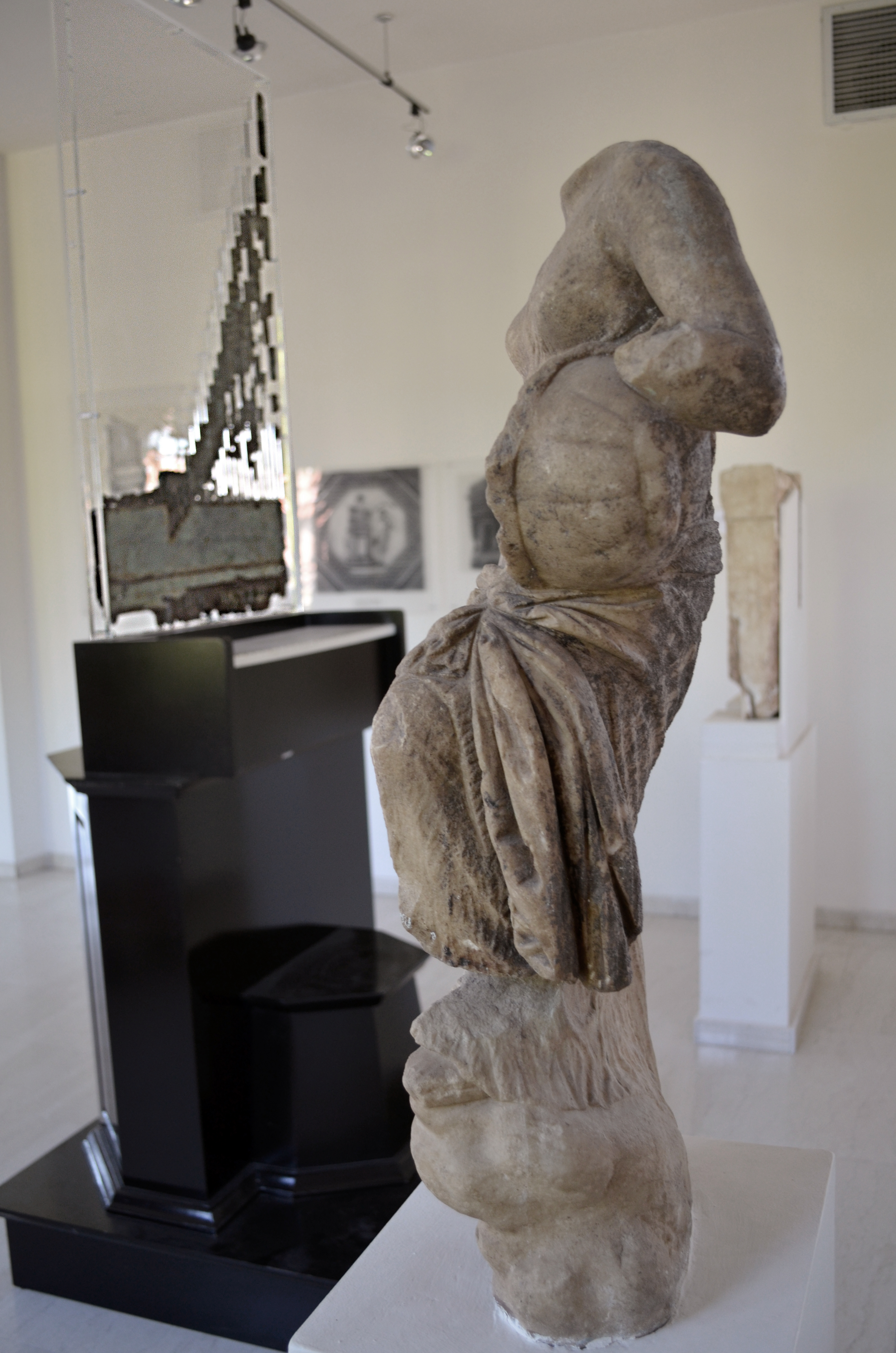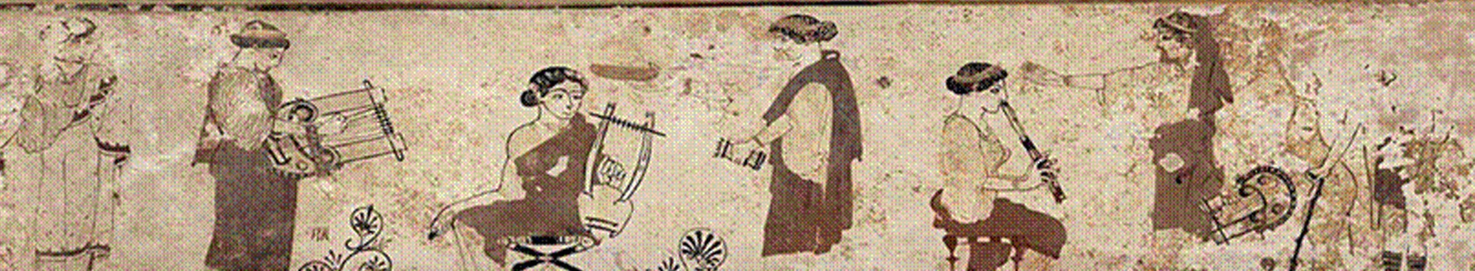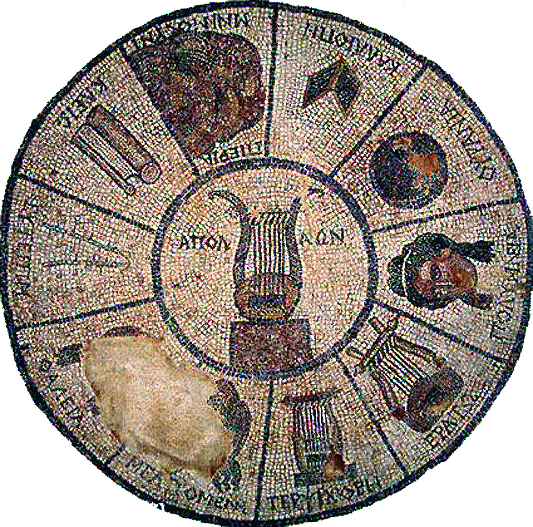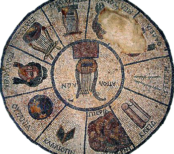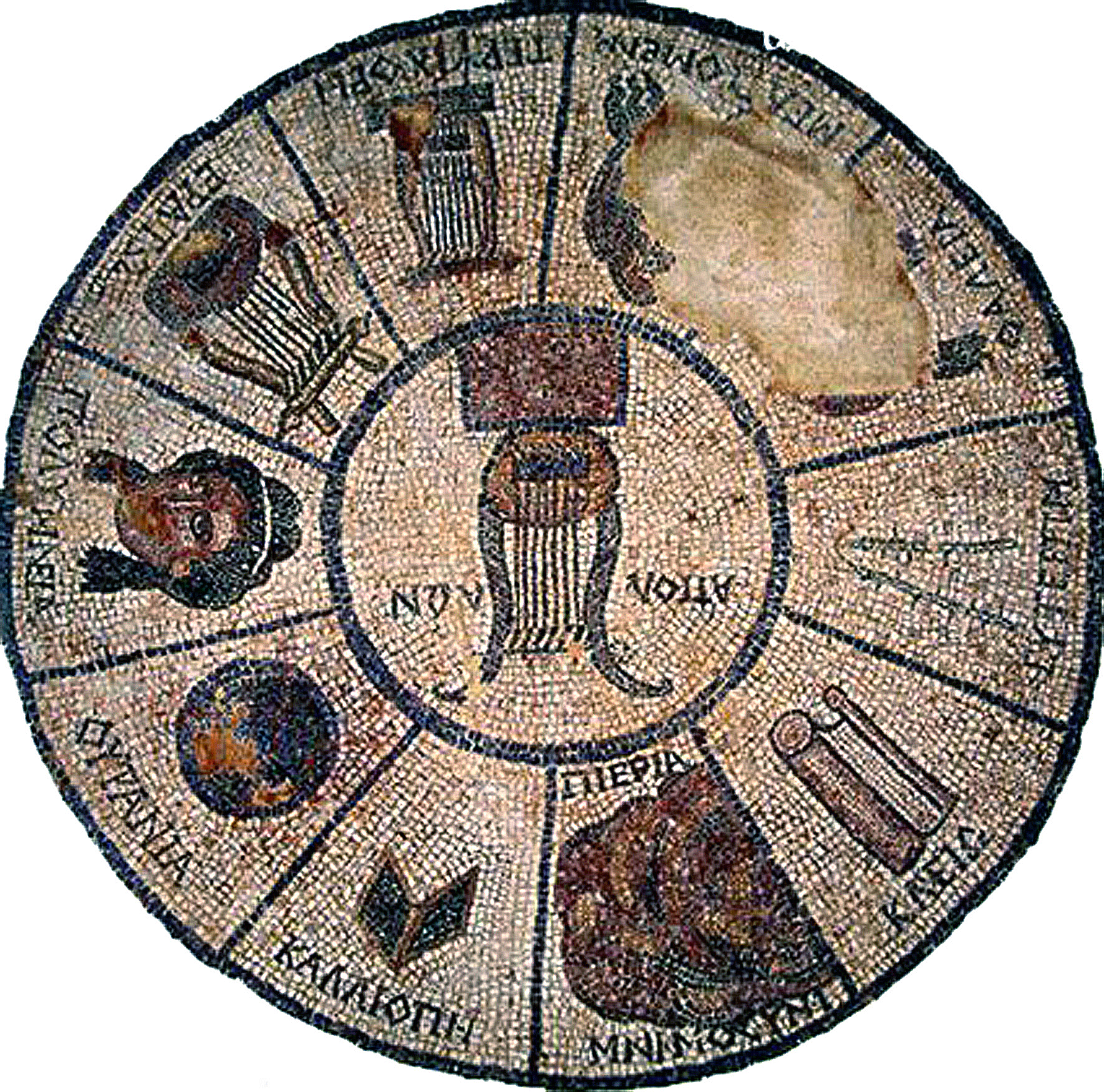 Υστερο - ελληνιστικό ψηφιδωτό από την Ήλιδα με τα σύμβολα των Μουσών, του Απόλλωνα και της Μνημοσύνης (αρχαιολογικό Μουσείο Ήλιδας): ο Απόλλων με λύρα, η Καλλιόπη με πινακίδα, η Ουρανία με ουράνια σφαίρα, η σκεπτόμενη Πολύμνια χωρίς σύμβολο, η Ερατώ και η Τερψιχόρη με λύρες, η Μελπομένη και η Θάλεια με θεατρικές μάσκες, η Ευτέρπη με αυλό, η Κλειώ με πάπυρο και η Μνημοσύνη με το όρος Πιερία. (© ΥΠ.ΠΟ.Α)